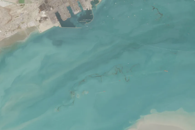 Ảnh vệ tinh cho thấy mức độ tàn phá tại Vịnh Ba Tư, trong đó hệ sinh thái vốn mong manh đang chịu tác động nặng nề. Dầu tràn không chỉ gây ô nhiễm môi trường biển mà còn đe dọa trực tiếp đến đời sống và sinh kế của người dân ven bờ.