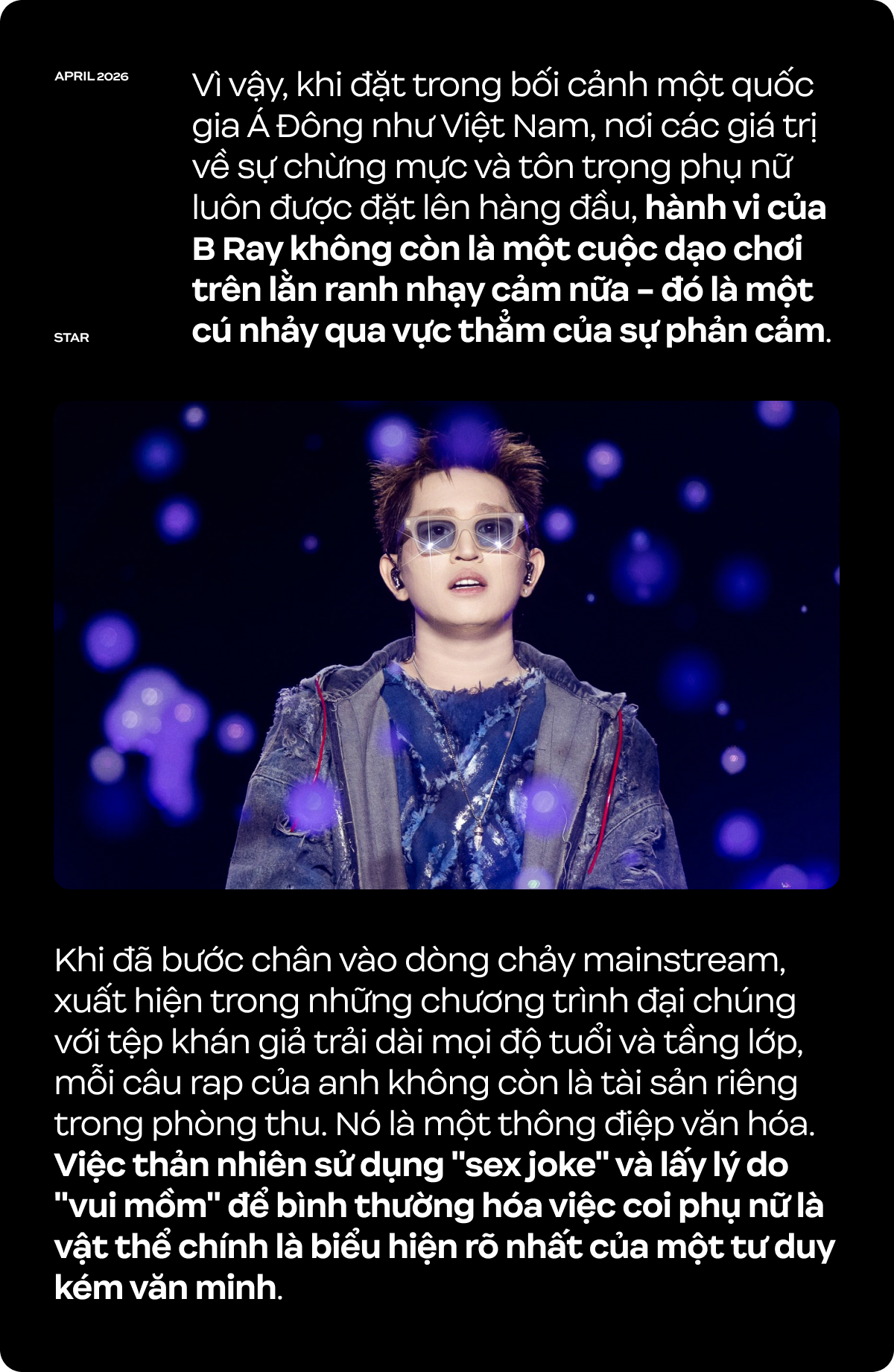 Vì vậy, khi đặt trong bối cảnh một quốc gia Á Đông như Việt Nam, nơi các giá trị về sự chừng mực và tôn trọng phụ nữ luôn được đặt lên hàng đầu, hành vi của B Ray không còn là một cuộc dạo chơi trên lằn ranh nhạy cảm nữa - đó là một cú nhảy qua vực thẳm của sự phản cảm. Khi đã bước chân vào dòng chảy mainstream, xuất hiện trong những chương trình đại chúng với tệp khán giả trải dài mọi độ tuổi và tầng lớp, mỗi câu rap của anh không còn là tài sản riêng trong phòng thu. Nó là một thông điệp văn hóa. Việc thản nhiên sử dụng "sex joke" và lấy lý do "vui mồm" để bình thường hóa việc coi phụ nữ là vật thể chính là biểu hiện rõ nhất của một tư duy kém văn minh.