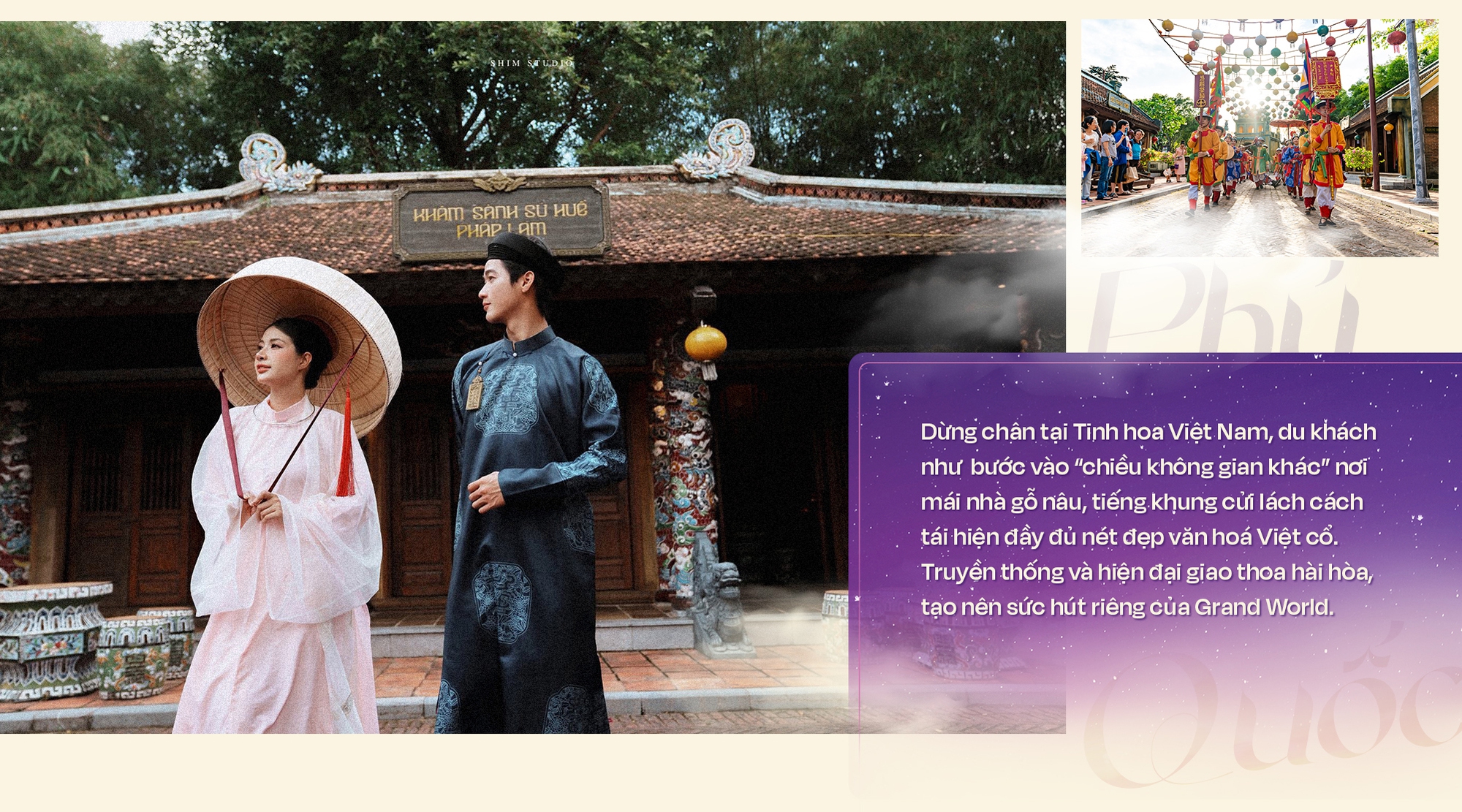 Giữa vẻ đẹp hiện đại, náo nhiệt của Grand World, du khách cũng có thể bất chợt "xuyên không" về phố Việt Xưa với kiến trúc kinh thành biệt lập và phong cảnh tự nhiên xưa, nép mình sau lũy tre làng. Tinh hoa Việt Nam hoạt động mỗi ngày, tái hiện Việt Nam xưa, với những người "sống trong vai" cư dân kinh thành cổ, khiến trải nghiệm không chỉ là ngắm nhìn, mà là một cuộc dạo bước giữa không gian văn hóa.