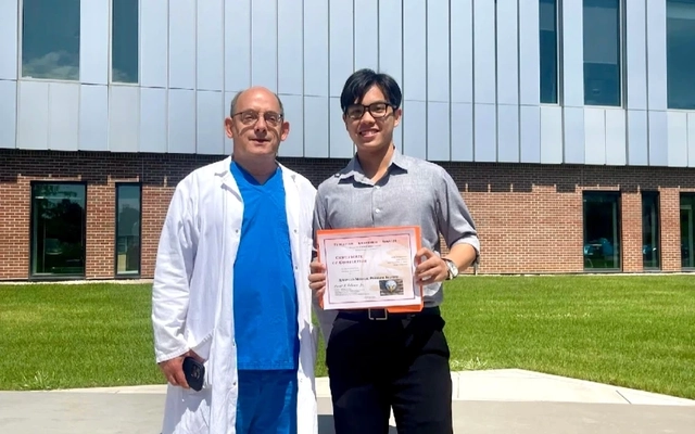 Âu Nhật Huy (phải) là thí sinh trẻ nhất trúng tuyển chương trình tiến sĩ Trường ĐH Y khoa Phạm Ngọc Thạch ở tuổi 24