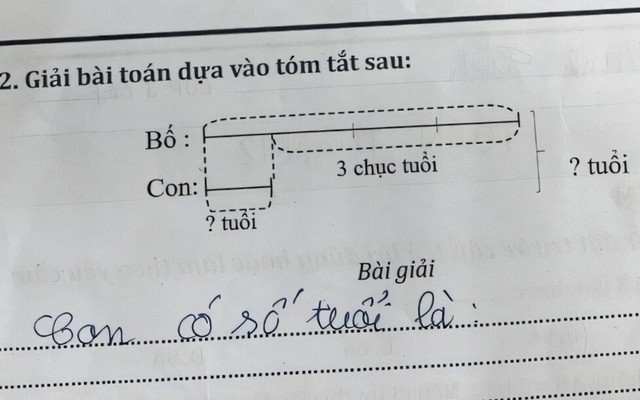Bài toán đưa ra mối quan hệ tuổi tác giữa bố và con thông qua một sơ đồ đoạn thẳng trực quan. Theo đó, tuổi của bố được biểu diễn dài hơn tuổi của con, trong đó phần chênh lệch giữa hai người được ghi chú là 30 tuổi. Tuy nhiên, đề bài không cho biết con số cụ thể mà yêu cầu người giải tự suy luận để tìm ra số tuổi của mỗi người.