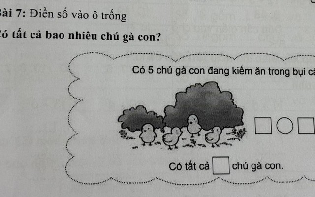 Mới đây, mạng xã hội tiếp tục xôn xao trước một bài toán lớp 1 được chia sẻ trong một hội nhóm phụ huynh Hà Nội. Bài đăng nhanh chóng thu hút hàng chục nghìn lượt tương tác vì độ “khó ra phết” dù chỉ là kiến thức dành cho học sinh mới vào tiểu học. Theo hình ảnh được lan truyền, đề bài yêu cầu “Điền số vào ô trống” và đặt câu hỏi: “Có tất cả bao nhiêu chú gà con?”. Ngay bên dưới là một bức tranh vẽ những chú gà con đang đứng trước bụi cây, kèm theo dòng chữ: “Có 5 chú gà con đang kiếm ăn trong bụi cây”.