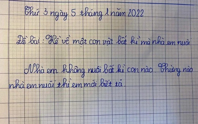 Theo đó, cậu bé nhận được đề bài là: "Kể về một con vật bất kỳ mà nhà em nuôi". Thông thường, các cô cậu học trò ở độ tuổi này thường sẽ chọn con chó, con mèo, thậm chí con gà để tả, nhưng cậu bé này lại chọn một lối đi hoàn toàn khác biệt, đó chính là thú nhận nhà em... không có con vật nào để tả cả! Thế là cậu bé quyết định "đối đáp thẳng" với đề bài, biến bài văn thành "tuyên ngôn" ngắn gọn nhưng siêu chất.