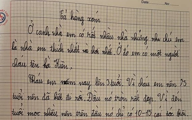 Cách đây không lâu, một bài văn miêu tả hàng xóm của một cậu bé lớp 2 đã trở thành tâm điểm chú ý trên mạng xã hội, khiến dân mạng không thể nhịn cười. Đề bài yêu cầu đơn giản: "Tả hàng xóm", nhưng thay vì miêu tả cả xóm hay một người hàng xóm điển hình, cậu bé lại chỉ tập trung vào người cháu nhỏ của mình với những chi tiết ngây ngô, chân thực đến mức "phũ phàng". Bài văn không chỉ hài hước mà còn khiến người ta phải thốt lên: "Phen này láng giềng lục đục mất thôi!".
