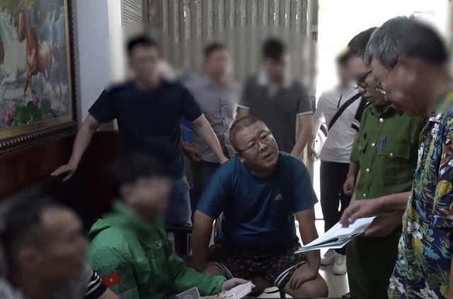 Đối tượng Vũ Tử Cường (ngồi giữa, áo xanh) vừa bị Công an tỉnh Khánh Hòa bắt khi đang trốn tại một khách sạn ở phường Nha Trang, tỉnh Khánh Hòa. Ảnh: Công an tỉnh Khánh Hòa