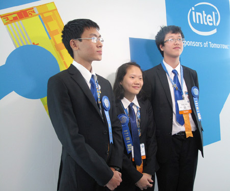 Ba học sinh trường THPT Amterdam - Hà Nội (từ trái qua phải: Vũ Anh Vinh, Bùi Thị Quỳnh Trang và Trần Bách Trung) đoạt giải Nhất lĩnh vực Điện và Cơ khí tại Hội thi Khoa học và Kỹ thuật Quốc tế (Intel ISEF) 2012 tại Mỹ. Bộ GD-ĐT sẽ dành kinh phí hỗ trợ cho các bạn nghiên cứu phát triển đề tài.