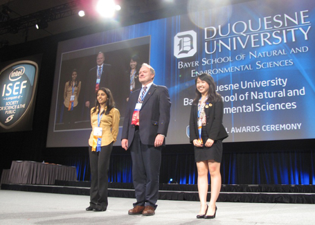 Vũ Mai Anh (phải) giành học bổng trị giá 2.500 USD của Đại học Duquesne.