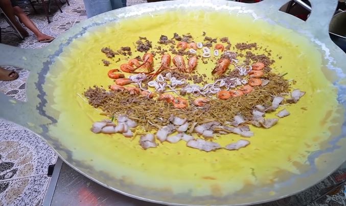 Khác với bánh xéo nhỏ, nhân sẽ để tươi, xào sơ trên mặt chảo dầu rồi cho bột vào, nhân bánh khổng lề được xào nấu chín hết rồi mới xếp vào bánh. Gọi là bánh xéo 1 triệu, nhưng chị Tám cũng khá chiều khách, nếu không thích ăn món nào có thể dặn chừa lại, trừ đi 300 ngàn/món.