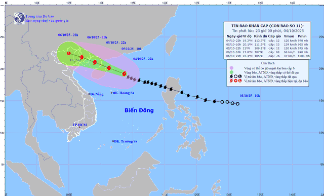 Trung tâm Dự báo Khí tượng thủy văn quốc gia cho biết, vào lúc 22h đêm 4/10, bão Matmo (bão số 11) nằm trên khu vực Bắc Biển Đông, cách Quảng Ninh khoảng 680km về phía Đông Nam. Sức gió mạnh nhất: Cấp 12 (118-133km/h), giật cấp 15. Trong những giờ tới, bão di chuyển theo hướng Tây Tây Bắc, tốc độ khoảng 25km/h.