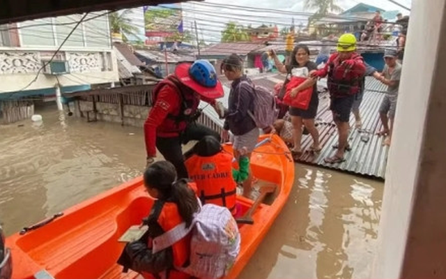 Lực lượng cứu hộ của Đơn vị Ứng phó Khẩn cấp thuộc Hội Chữ thập đỏ Philippines giải cứu những cư dân mắc kẹt trên mái các ngôi nhà bị ngập sâu tại Barangay Singcang Airport, thành phố Bacolod vào ngày 25/11. Ảnh: Bacolod.