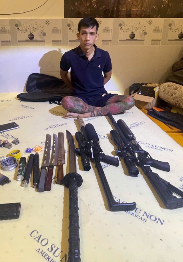 Bên trong túi có 2 khẩu súng loại súng hơi dài 90cm (có báng súng, có bình khí nén, ống ngắm); 2 hộp đạn chì (mỗi hộp 100 viên đạn chì); 2 bịch đạn bằng nhựa; 3 cây dao tự chế mỗi cây dài khoảng 50cm và 1 cây dao tự chế dài khoảng 90cm có vỏ bọc màu đen; 1 bình xịt hơi cay.