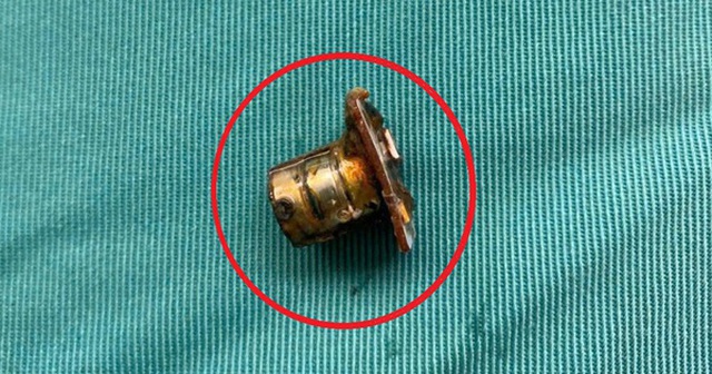 Kết quả chụp X-quang cho thấy một dị vật kim loại mắc tại thực quản, nghi là bộ phận chứa pin cúc áo. Ê-kíp bác sĩ Khoa Chẩn đoán hình ảnh đã nhanh chóng tiến hành nội soi cấp cứu, lấy cụm pin cúc áo ra ngoài thành công.