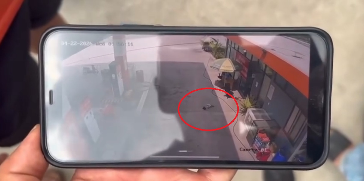 Thời điểm xảy ra sự việc, cháu bé 2 tuổi đang nằm chơi dưới nền của cây xăng. (Ảnh cắt từ clip)