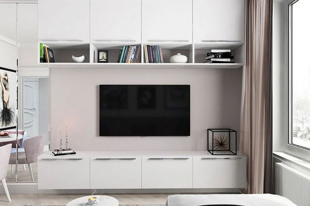 Đối diện với sofa được lắp đặt tivi màn hình lớn, phía trên dưới được tận dụng diện tích, lắp đặt tủ đồ, kệ sách.