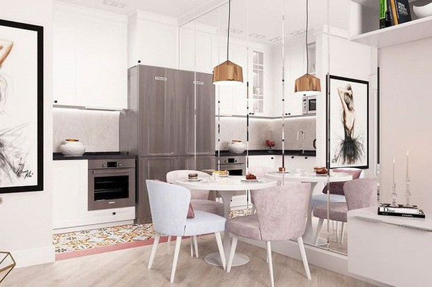 Những chiếc gương được bố trí ở nhiều vị trí, từ lối ra vào, phòng ngủ giúp "ăn gian" diện tích không gian.