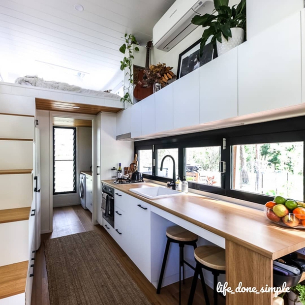 Nhà bếp là không gian được chú trọng nhất trong quá trình xây dựng. Căn bếp được thiết kế dọc theo thân của căn nhà. Bàn bếp nối liền với khu vực rửa bát, phía bên trên là hệ tủ dài dùng để đựng bát đĩa, đồ dùng. Amy cho biết, căn bếp này đang làm rất tốt công việc của nó. Điều khiến cô hài lòng nhất chính là những ngăn chứa đồ giúp cô sắp xếp đồ đạc để phòng bếp và ngôi nhà luôn gọn gàng, ngăn nắp.