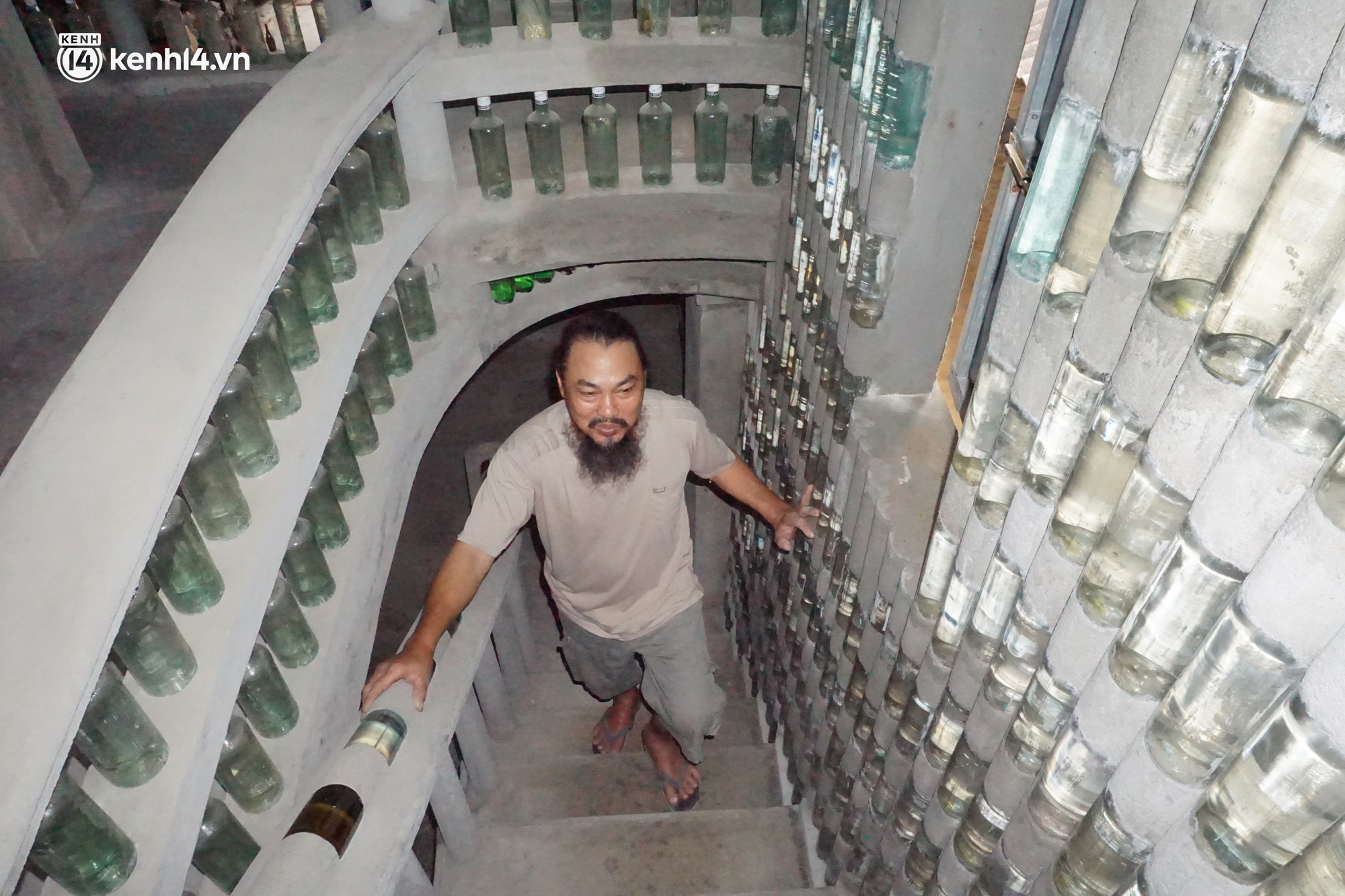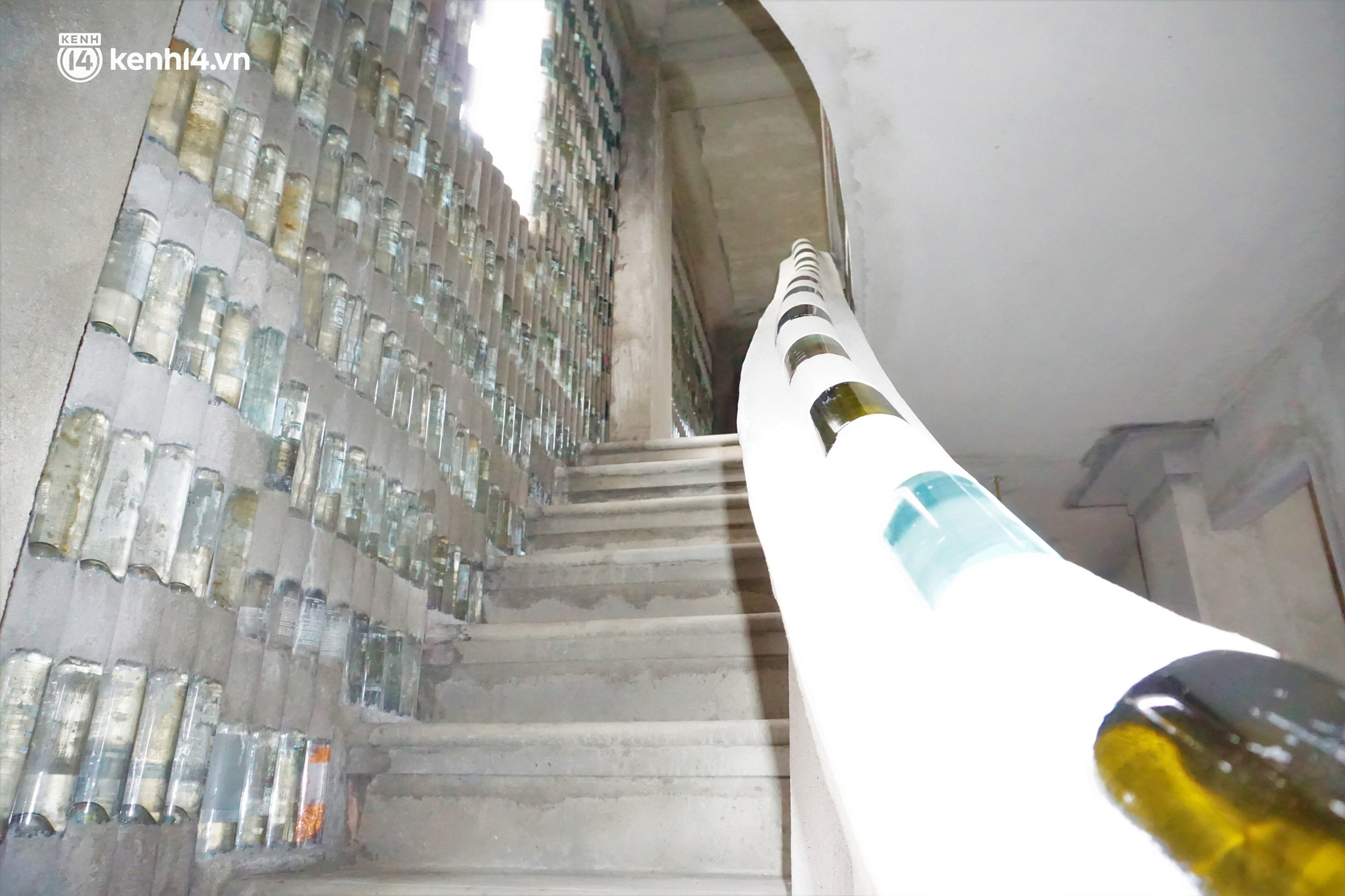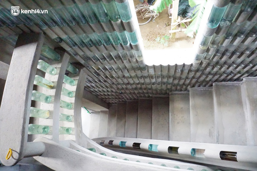 2 cầu thang, lan can, tường, trụ,… tất cả các chi tiết trong nhà đều được ông trang trí bằng vỏ chai dày đặc và đủ màu sắc