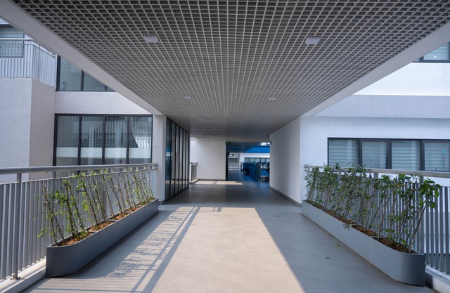 Một trong những điểm nhấn đáng chú ý trong thiết kế là mái che di động nối giữa khối nhà chính và khu hiệu bộ phía sau. Giải pháp này vừa đảm bảo ánh sáng tự nhiên cho sân trường, vừa linh hoạt che mưa nắng, phục vụ các hoạt động tập trung và sân khấu.