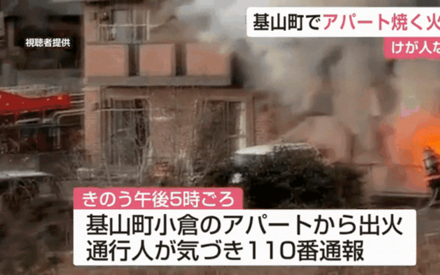 Một vụ hỏa hoạn xảy ra vào khoảng 5 giờ 5 phút chiều ngày 3 tháng 1 tại một khu căn hộ ở Ogura, thị trấn Kiyama, Saga, Nhật Bản. Một người dân sống gần đó đã gọi điện báo cảnh sát sau khi phát hiện khói đen bốc ra từ tòa nhà.