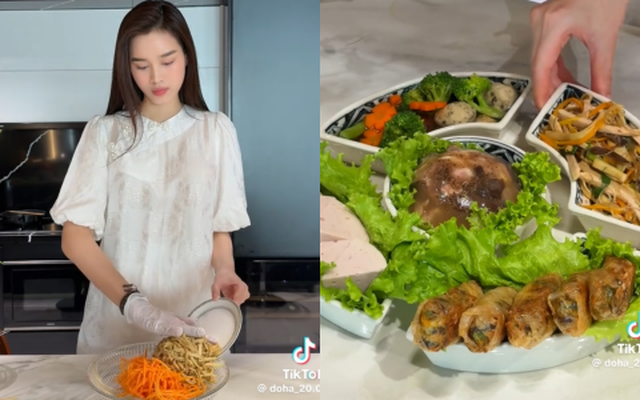 Mới đây, nàng hậu tiếp tục khiến dân mạng chú ý khi đăng vlog tự tay chuẩn bị mâm cỗ cúng 23 Tết với loạt món quen thuộc như nem rán, thịt đông, canh hầm, bánh chưng, gà luộc, miến hấp giò chả… Hình ảnh Đỗ Thị Hà nấu nướng chuyên nghiệp, gọn gàng nhanh chóng gây chú ý.