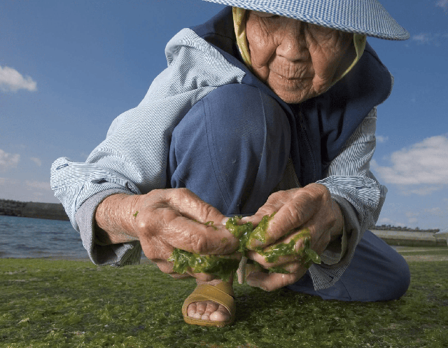 Cụ Kame Ogido, 90 tuổi, kiểm tra một nhúm rong biển, một phần của chế độ ăn ít calo, chủ yếu là thực vật, có thể giúp người dân Okinawa có tuổi thọ trung bình lên đến 82 năm, thuộc hàng cao nhất thế giới. Ảnh: David McLain/National Geographic