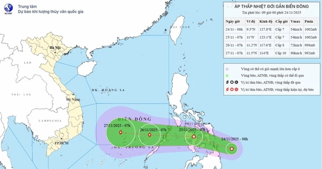 Dự báo khoảng đêm 25 rạng sáng 26/11, ATNĐ sẽ đi vào Biển Đông. Trong ngày 26/11, khi còn cách đất liền Nam Trung Bộ khoảng 1.000km, ATNĐ có khả năng mạnh lên thành bão.