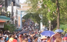 Nhìn từ trên cao, các cung đường gần khu vực rước kiệu lá đều đông kín người chờ đợi, ngóng xem.
