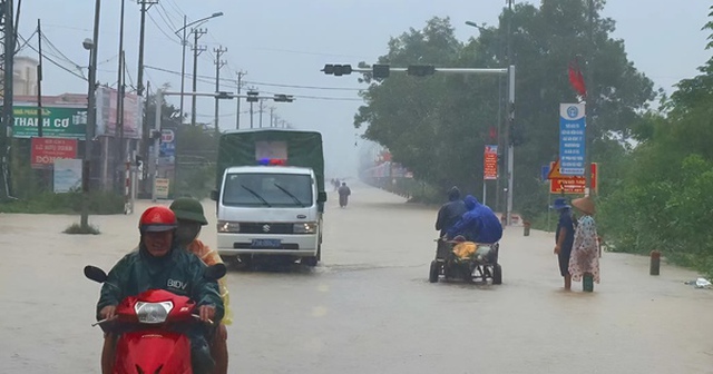 Ngày 3-11, sau nhiều giờ mưa lớn, nước lũ từ thượng nguồn đổ về khiến "rốn lũ" xã Lệ Thủy (tỉnh Quảng Trị) chìm trong biển nước. Mực nước sông Kiến Giang đã vượt báo động 3, nhiều khu dân cư bị chia cắt, một số nơi người dân phải dùng thuyền để đi lại.