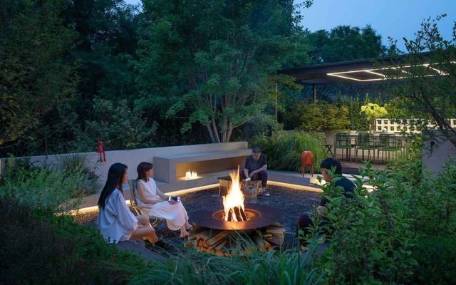 Không gian sân vườn có thể được biến thành nơi thư giãn vào buổi tối với bếp lửa ấm.