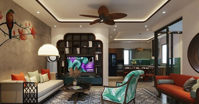 Dấu ấn Indochine đương đại hiện diện xuyên suốt trong ngôi nhà qua bảng màu trung tính được nhấn nhá bằng xanh ngọc, cam đất; hệ phào chỉ mềm mại; những mảng tường vẽ tay và nền gạch bông hoài cổ giàu tính nghệ thuật. Sự kết hợp giữa gạch bông truyền thống và nội thất hình khối bo cong giúp không gian trở nên mềm mại, gợi nhắc tinh thần Á Đông xưa cũ nhưng được làm mới bằng ngôn ngữ thiết kế hiện đại. Mỗi không gian – từ phòng khách, bếp, phòng ngủ đến khu thay đồ – đều mang một cá tính riêng, song vẫn hòa quyện trong tổng thể thống nhất, có chiều sâu.