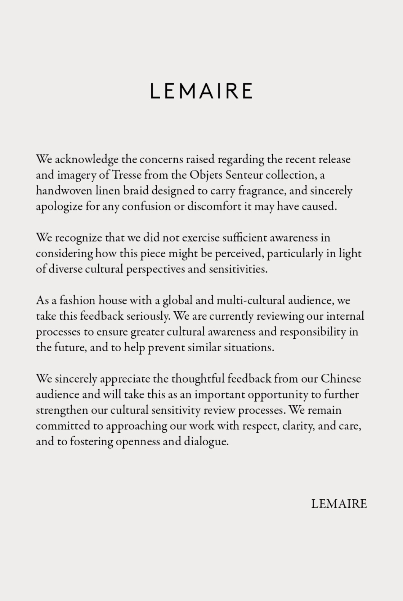 Trong bộ sưu tập Objets Senteur vừa ra mắt, Lemaire đã giới thiệu một sản phẩm mang tên Tresse, đây là một dải vải lanh dệt tay được bện thành hình bím tóc dài dùng để khuếch tán hương thơm có giá bán 56.100 Yên Nhật (hơn 9,2 triệu đồng). Tuy nhiên, những hình ảnh quảng bá trên Instagram và các nền tảng quốc tế của Lemaire đã ngay lập tức vấp phải sự phản ứng dữ dội từ công chúng xứ Trung.