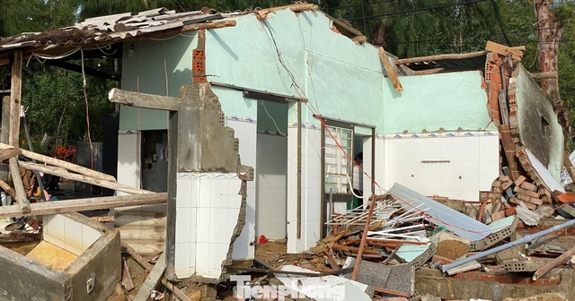 Cách đó không xa, chị Trần Thị Thu Thủy (36 tuổi, trú tổ dân phố Thạch By 2) lặng lẽ nhặt nhạnh vài vật dụng còn sót lại giữa đống đổ nát. Căn nhà được chằng chống kiên cố trước bão nhưng vẫn không chịu nổi sức tấn công dữ dội của triều cường.