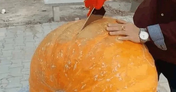Nào ngờ khi quả bí ngô được bổ ra hoàn toàn, những gì có bên trong khiến người đàn ông lập tức... tiu nghỉu!