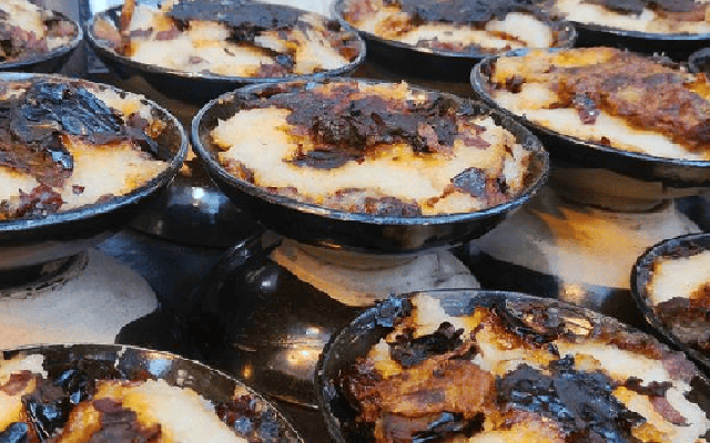 Bánh Tăng (Zeng-gao, Chính Cao) là món ăn sáng kinh điển gắn liền với ký ức tuổi thơ của biết bao người con vùng Quan Trung. Trong chiếc nồi đất nung (gọi là Tăng) khổng lồ, những lớp gạo nếp trắng ngần được xếp xen kẽ với táo đỏ và đậu đỏ, đồ chín suốt nhiều giờ đồng hồ. Khi múc ra bát, bánh dẻo quánh, kéo sợi như phô mai, màu đỏ thẫm của táo nhuộm hồng cả hạt gạo. Vị ngọt của bánh đến hoàn toàn từ táo đỏ, tự nhiên và dễ chịu. Một miếng bánh dẻo thơm, uống cùng cốc sữa đậu nành nóng hổi, là đủ năng lượng cho một ngày dài khám phá.