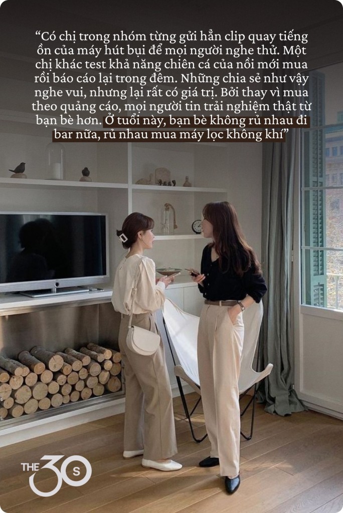 Mai Anh bày tỏ: “Có chị trong nhóm từng gửi hẳn clip quay tiếng ồn của máy hút bụi để mọi người nghe thử. Một chị khác test khả năng chiên cá của nồi mới mua rồi báo cáo lại trong đêm. Những chia sẻ như vậy nghe vui, nhưng lại rất có giá trị. Bởi thay vì mua theo quảng cáo, mọi người tin trải nghiệm thật từ bạn bè hơn. Ở tuổi này, bạn bè không rủ nhau đi bar nữa, rủ nhau mua máy lọc không khí”.