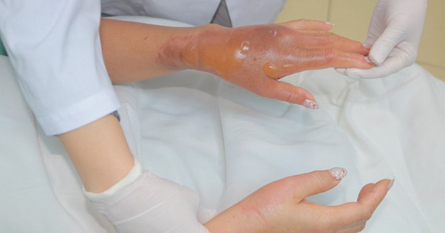 Bác sĩ Đinh Thị Lê Thành, Phó Khoa Dị ứng miễn dịch và Da liễu, cho biết mu bàn tay trái và bàn tay phải của bệnh nhân có nhiều mụn nước, da đỏ, đau rát nhưng chưa hoại tử nhờ nhập viện sớm. Người bệnh đang được làm sạch tổn thương, bôi thuốc điều trị bỏng, dùng kháng sinh, giảm đau và băng gạc ẩm, tiếp tục theo dõi.