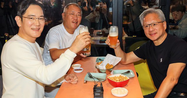 Tối 30-10, ba lãnh đạo doanh nghiệp công nghệ hàng đầu thế giới - ông Jensen Huang (Nvidia), ông Lee Jae-yong (Samsung) và ông Chung Eui-sun (Hyundai Motor Group) - cùng xuất hiện tại một nhà hàng Kkanbu Chicken ở khu Samseong-dong, Seoul.