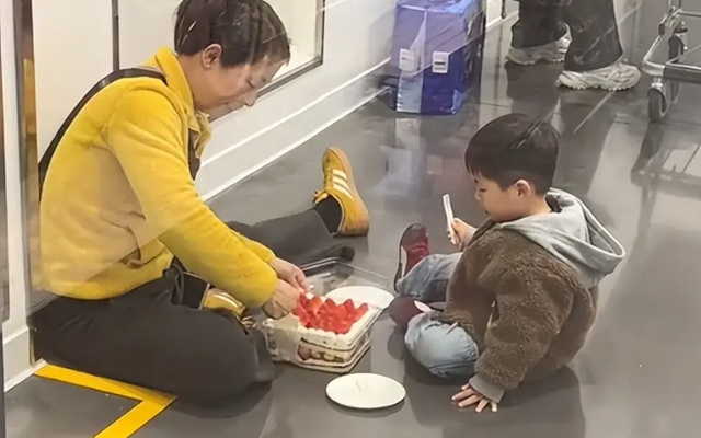 Trong đoạn clip được chia sẻ trên mạng xã hội, một cậu bé mẫu giáo cùng mẹ ngồi bệt ngay dưới đất để ăn chiếc bánh kem dâu tây. Nhìn qua thì chẳng sang chảnh gì, thậm chí có người còn mỉa mai: "Trông như người vô gia cư, sao không mang về nhà mà ăn cho lịch sự?".