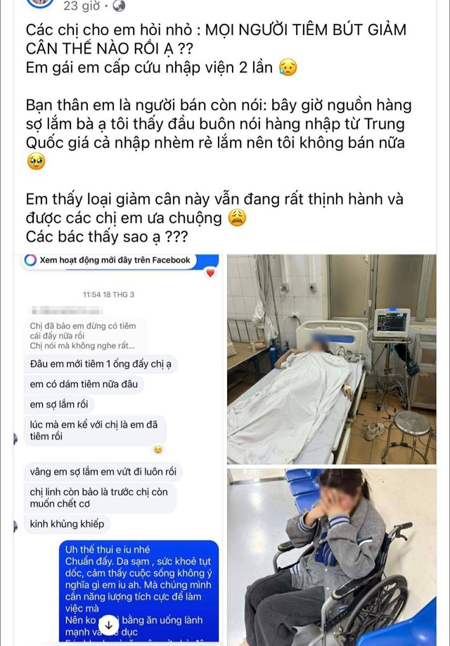 Không phải quảng cáo, không phải review "before - after" lung linh. Đây là một lời cầu cứu, xen lẫn hoang mang và sợ hãi của một người dùng mạng xã hội. Cùng với đó là hình ảnh một cô gái nằm trên giường bệnh, dây truyền chằng chịt, một ảnh khác là cô ngồi trên xe lăn, hai tay ôm mặt. Theo chia sẻ của người dùng thì cô gái trong ảnh mới tiêm 1 ống giảm cân và đang vô cùng sợ hãi.
