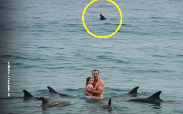 Chỉ ít phút sau, mối đe dọa đã lộ diện: một con cá mập trắng lớn dài gần 3 mét đang tiến vào khu vực này. Ngay lập tức, đàn cá heo thay đổi chiến thuật. Chúng dùng đuôi quất mạnh xuống mặt nước, lao đi theo những đợt phối hợp nhịp nhàng và tạo thành một lá chắn sống giữa những người đi bơi và kẻ săn mồi, chủ động xua đuổi con cá mập ra xa.