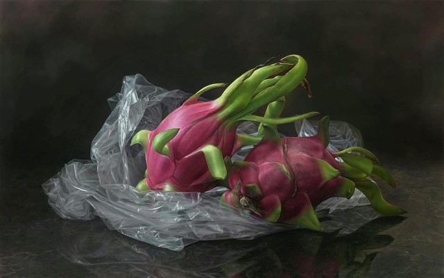 Bên cạnh đó, điều khiến bức tranh trở nên đặc biệt không chỉ là kỹ thuật siêu thực mà còn ở cách tác giả chọn đề tài. Không phải hoa lá cầu kỳ hay trái cây sang trọng mà là thanh long - một loại quả quá quen thuộc với người Việt. Một hình ảnh bình dị nhưng lại được nâng lên thành một hình tượng thẩm mỹ đầy sức nặng.