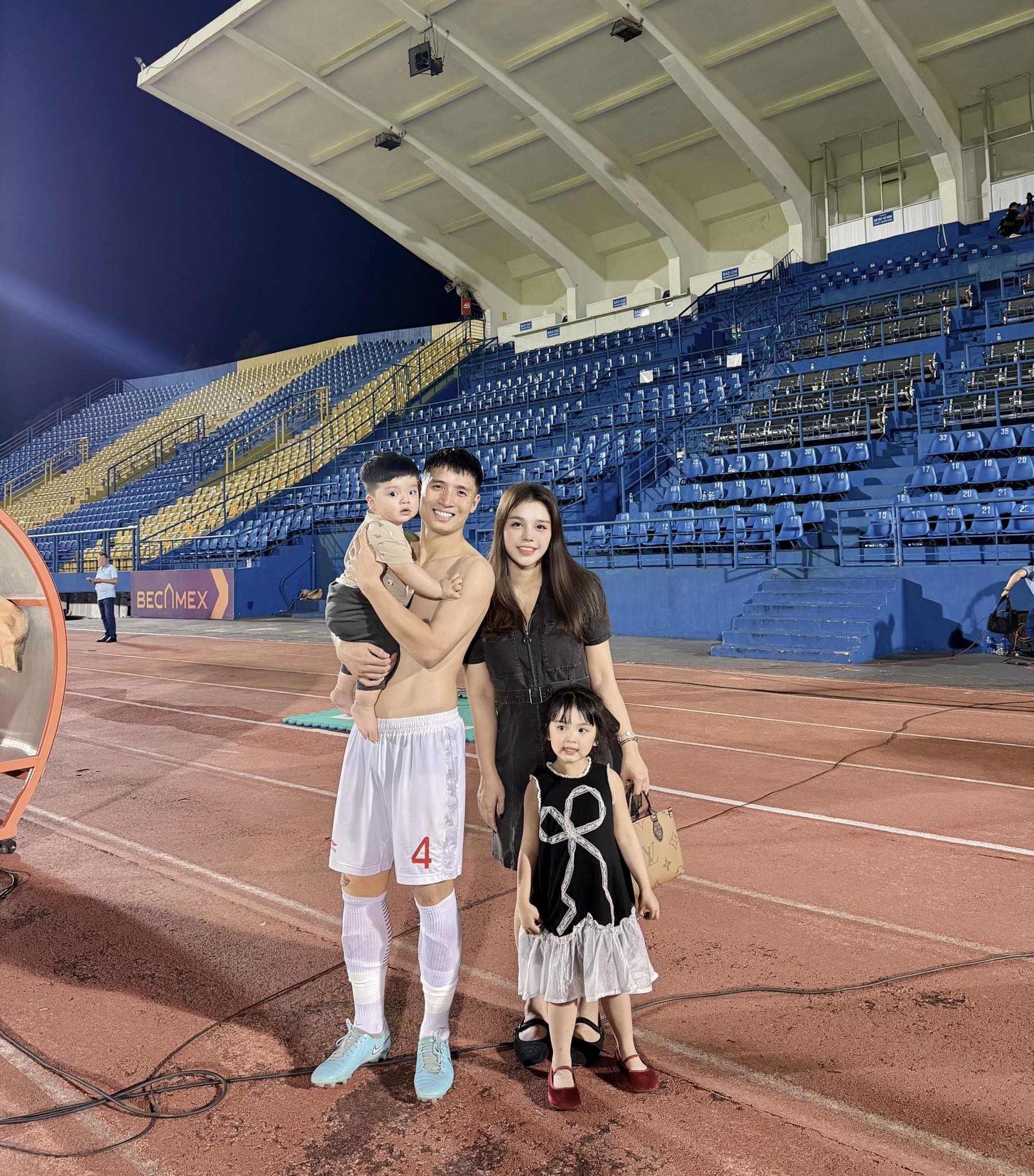 Bên cạnh nhân vật chính là bé Vin, nhan sắc rạng rỡ của mẹ bỉm sữa Nguyễn Khánh Linh cũng nhận được nhiều lời khen ngợi. Sau 3 lần sinh nở, cô vẫn giữ được phong độ sắc vóc mặn mà. Trung vệ Bùi Tiến Dũng không giấu được niềm hạnh phúc khi bế con trai trên tay, cho thấy sự viên mãn của "ông bố 3 con" sau những sóng gió hôn nhân từng gây ồn ào trước đây. Bé Bùi Nhật Vượng chào đời tháng 4/2025, gia đình Tiến Dũng hiện có 3 nhóc tỳ đáng yêu là Sushi, Mochi và em út Nhật Vượng.