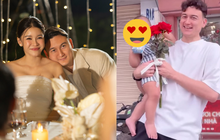 Khánh Linh chụp ảnh cậu con trai đang hướng về phía chiếc TV đúng lúc Tiến Dũng xuất hiện cùng dòng trạng thái đáng yêu: "Ơ, ai mà giống bố mình thế nhỉ".