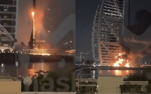 Công trình mang thiết kế hình cánh buồm đặc trưng, cao 321 mét và được xếp vào nhóm những khách sạn cao nhất thế giới, đã xảy ra hỏa hoạn sau khi các mảnh vỡ từ một máy bay không người lái Iran bị đánh chặn rơi trúng phần mặt ngoài tòa nhà.