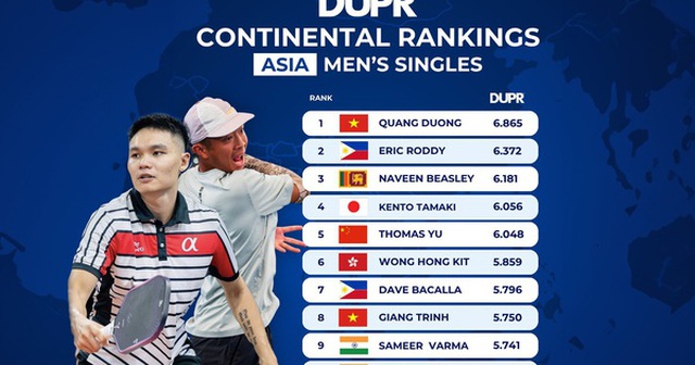 Bảng xếp hạng DUPR châu Á tháng 7/2025 tiếp tục ghi dấu ấn mạnh mẽ của pickleball Việt Nam trên đấu trường khu vực. Quang Dương, với 6.865 điểm, vẫn dẫn đầu bảng xếp hạng.