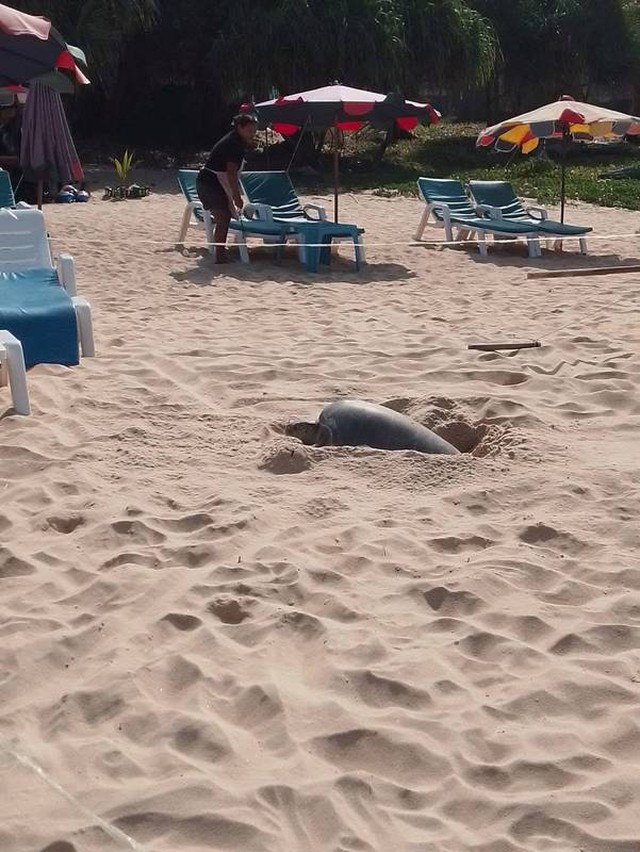 Bãi biển Karon, thuộc Phuket (Thái Lan) náo loạn vì sự xuất hiện của một sinh vật biển lên bờ làm tổ. (Ảnh: Thephuketnews)