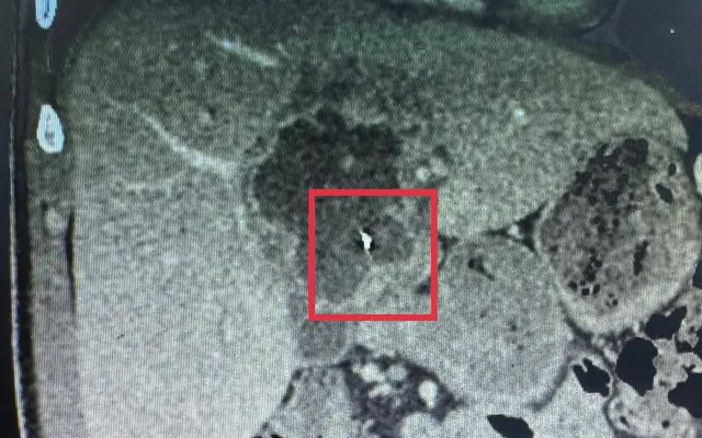 Bệnh nhân TT.L. (41 tuổi, xã Nhơn Phú, tỉnh Vĩnh Long) nhập viện vì đau dữ dội vùng thượng vị kèm sốt cao. Siêu âm và CT-scan ổ bụng phát hiện ổ áp xe gan kích thước khoảng 5x6cm, bên trong có dị vật kim loại dài gần 6cm.