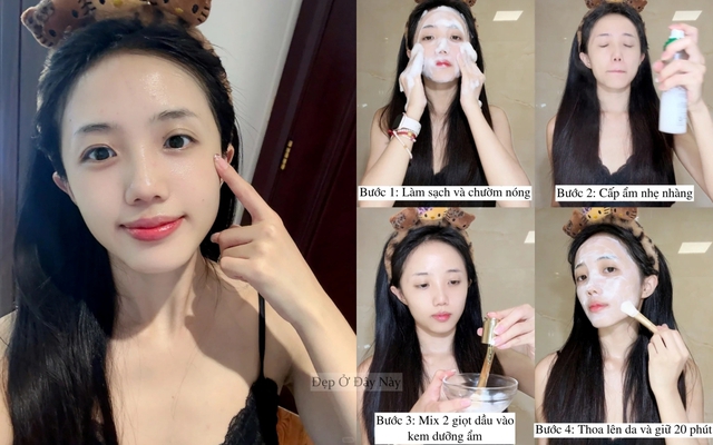 Đây là "linh hồn" của phương pháp. Sunni trộn một lượng kem dưỡng dày với 2 giọt tinh dầu dưỡng da, sau đó thoa đều và để trên mặt khoảng 20 phút. "Da chúng ta vốn 'ưa dầu', nên khi kết hợp dầu, các dưỡng chất sẽ thấm nhanh và sâu hơn nhiều," cô chia sẻ. "Sau 20 phút, tôi cảm giác da như vừa uống no nước, mềm và ấm mịn."