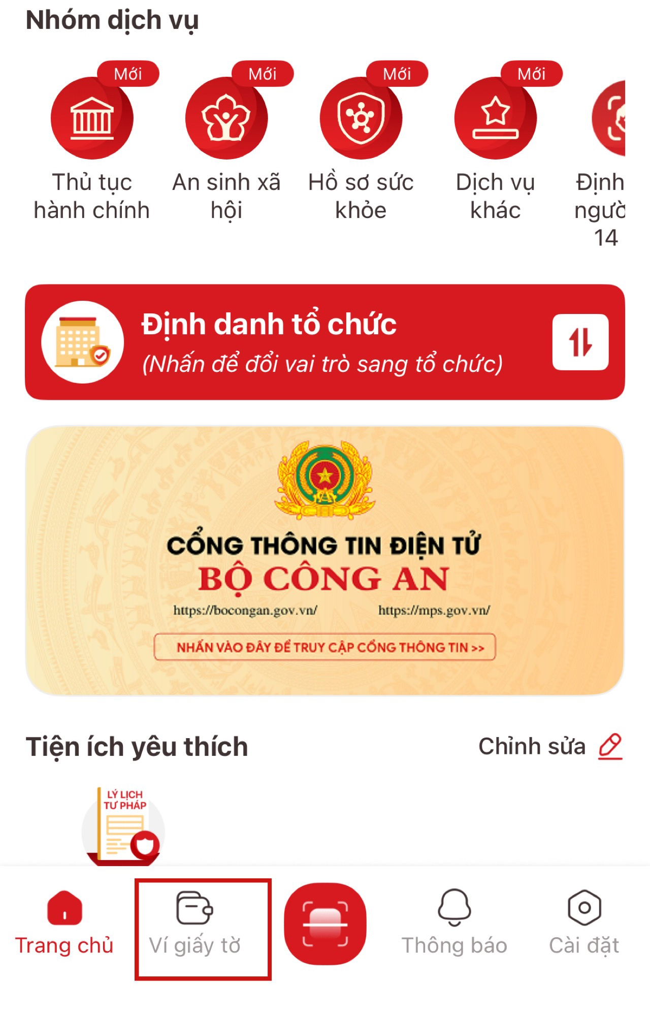 Tại giao diện chính của màn hình ứng dụng, bạn tìm và nhấn chọn vào mục "Ví giấy tờ".