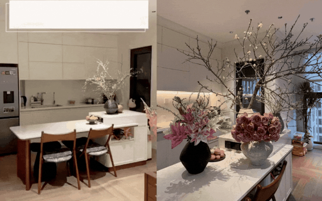 Khi Tết đến, Xuân về, căn bếp nhà H lại khoác lên mình diện mạo mới, rộn ràng và ấm áp hơn hẳn. Một cành đào tươi thắm, vài lọ hoa nhỏ xinh được bày biện tinh tế ngay trên bàn đảo, kết hợp cùng những chi tiết trang trí mang đậm không khí ngày Tết, khiến không gian bếp trở nên sinh động và tràn đầy sức sống.